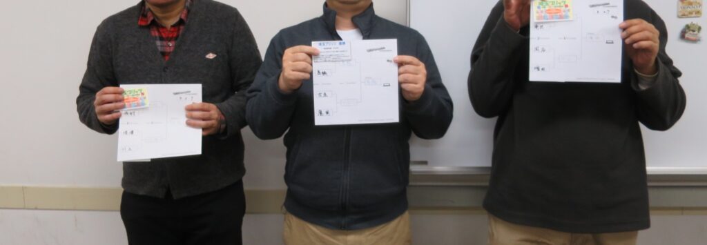 先月行なわれなかった決勝トーナメントですが、今月は参加券保持者の参加が有り、川上・江口・西村・古庄の4名で5ptのトーナメント戦の結果、江口さんがタマオー挑戦権を獲得しました。