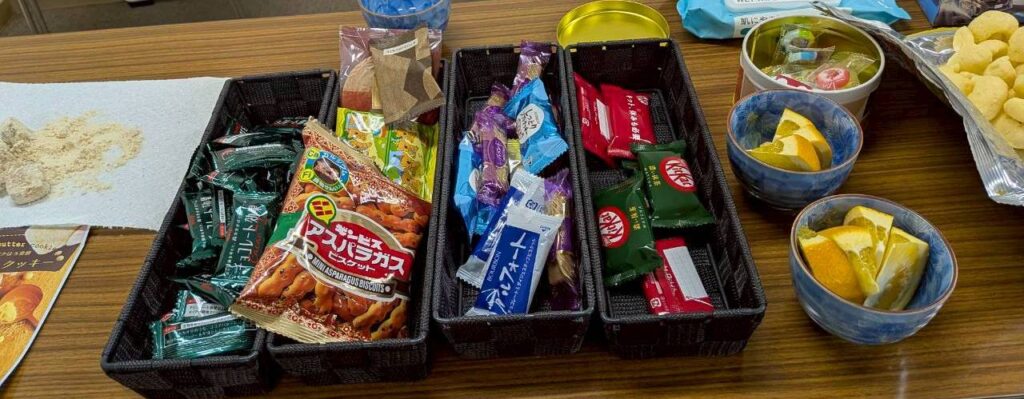 2時半頃からの会場の設営は、滝沢さんや川上さんにお手伝い頂きあっと言う間に完了しました。今月も滝沢さんから、オヤツのキットカットが差し入れられました。オヤツは、お煎餅やビスケットやチョコレート等々いっぱいです。今季最後の収穫の、朝採り野良ミカン(たぶんハッサク)もカットしました。